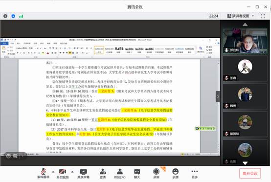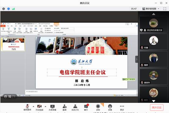 期末将至,为贯彻落实寒假期间学校对于学生安全教育及管理工作方面的要求,为把期末近期学生日常教育与管理工作做实、做好,确保我院同学能够提高自我防护意识,度过一个安全快乐的假期。2020年12月4日,电子信息学院以腾讯会议的方式召开了班主任、辅导员工作大会,会议由郭启炜书记亲自主持,本次会议以安全教育为中心,并展开寒假前后学生安全教育与管理工作部署。
