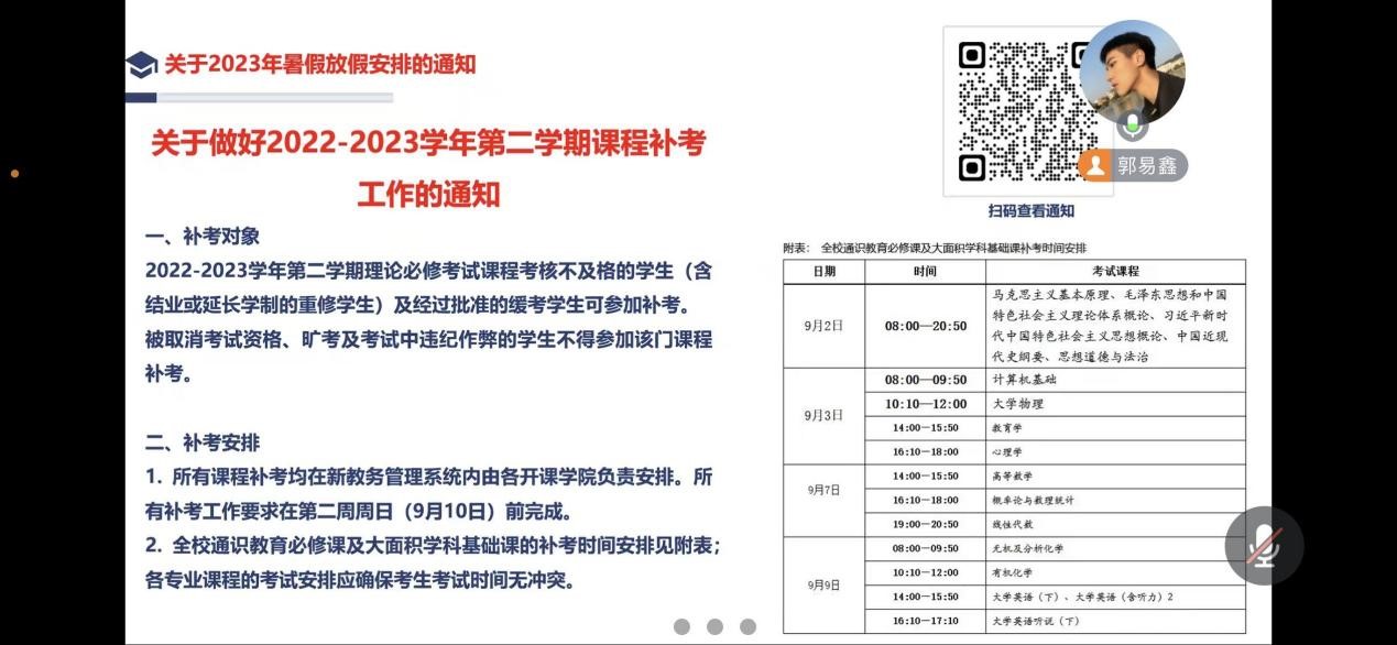 本次班会主要围绕以下三个方面开展,一是针对老生传达新学期教育教学事项,包括返校时间安排以及学费缴纳等;二是返校前安全教育,包括防溺水、防诈骗、大学生“禁酒令”等;三是针对2023级新生,讲解线上报到流程及注意事项等内容。