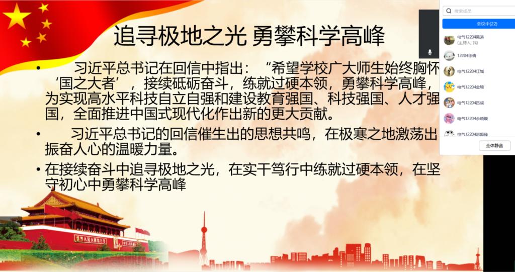 为深入学习习近平总书记给武汉大学参加中国南北极科学考察队的师生代表重要回信精神,引领青年学子牢记习近平总书记“胸怀‘国之大者’,接续砥砺奋斗,练就过硬本领,勇攀科学高峰”的殷殷嘱托,我院于1月19日至21日组织全体学生线上开展学习习近平总书记重要回信精神主题班会。