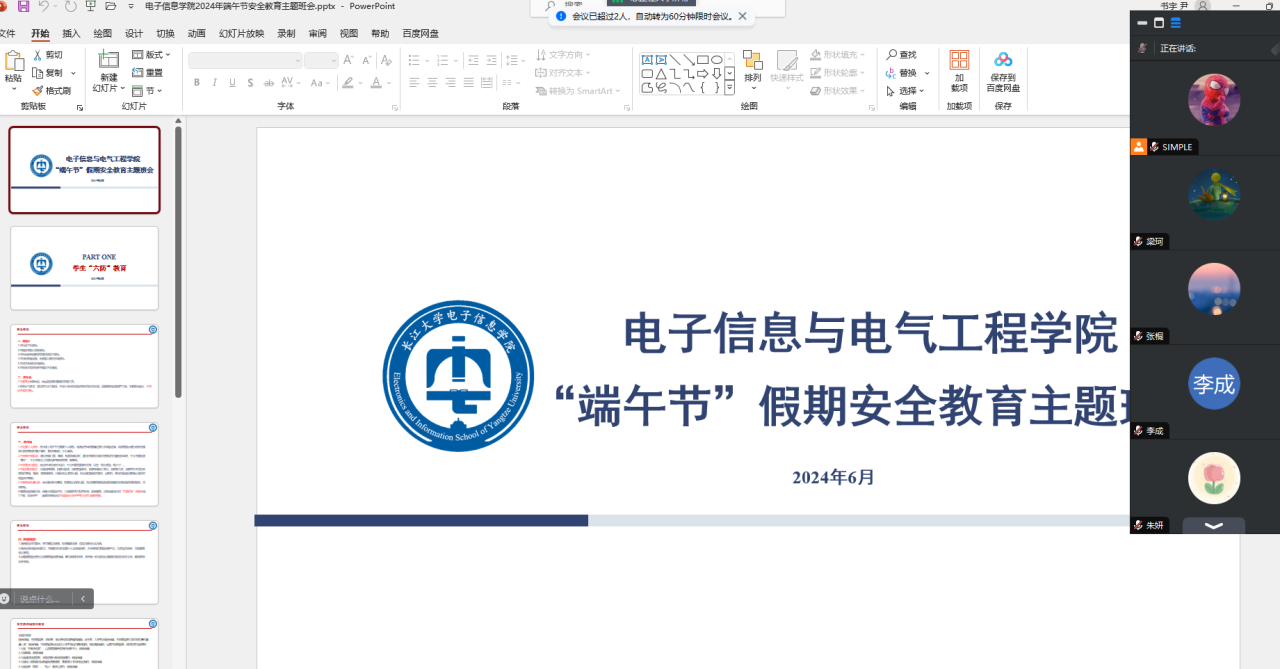 端午节假期临近,为进一步提高学生安全防范意识,筑牢安全防范底线,确保学生度过一个平安愉快的假期,学院于6月4日组织全体研究生开展了端午节假期安全教育主题班会。