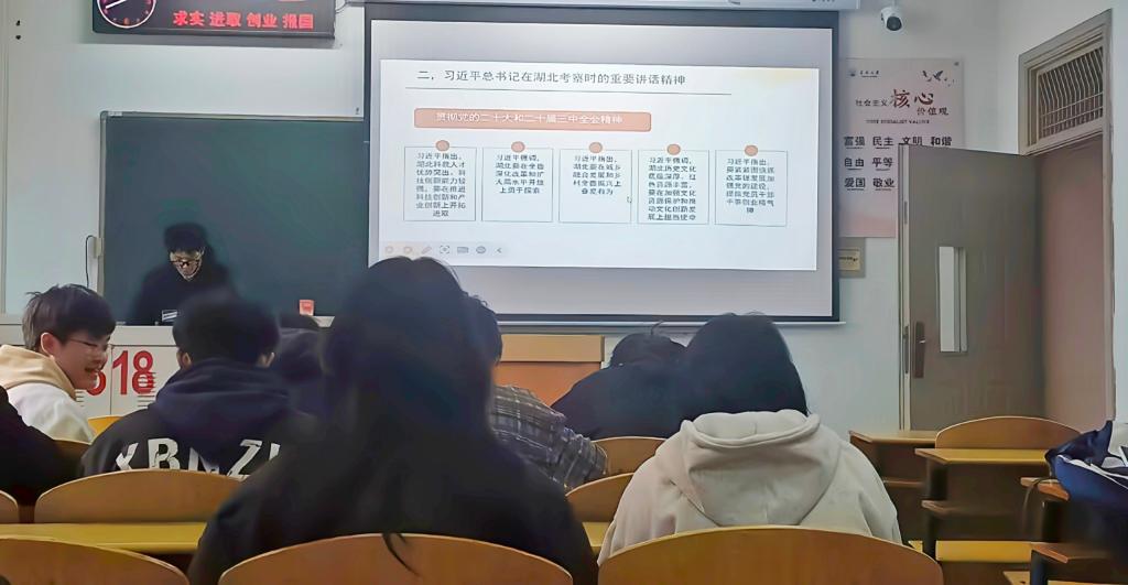 东校区13教c316教室举行班团会。主持人彭义豪同学为大家解读了习近平总书记在湖北考察时的重要讲话精神,强调了坚持新发展理念,推动高质量发展的重要性。在就业问题上,习近平总书记的讲话为同学们指明了方向,同时,主持人鼓励同学们积极参与学校组织的“生涯嘉年华”和“生涯闯关大赛”等活动。通过学习,同学们更加明确了个人职业规划的重要性,并表示将积极提升自身素质,为实现高质量就业做好准备。