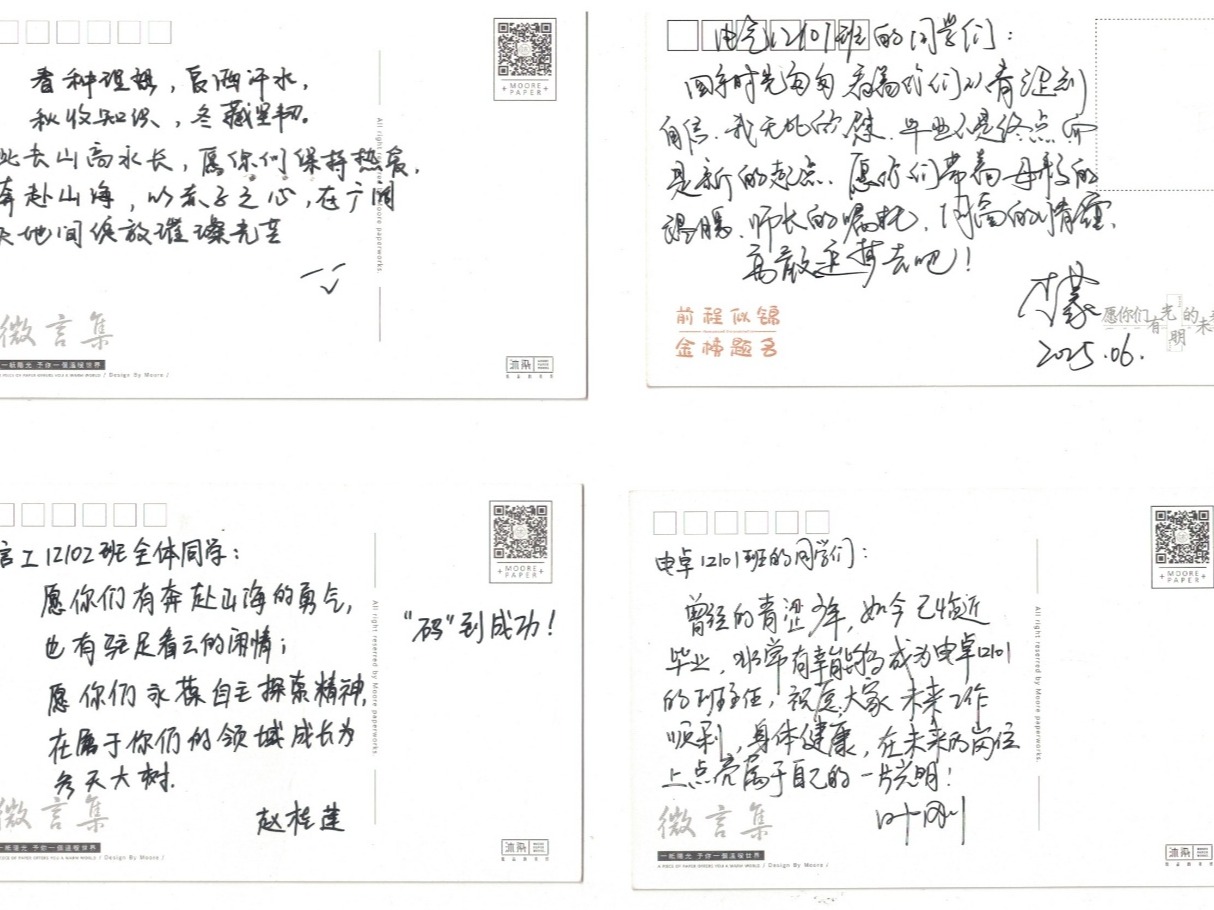 同窗情深,彰显明信片里的青春印记。在“致同窗”环节,同学们互写祝福明信片,既有“愿我们江湖再见时,你仍是追风少年”的豪迈,也有“记得帮我占图书馆座位的情谊”的俏皮回忆。一张张明信片成为同窗情谊的“时光胶囊”。