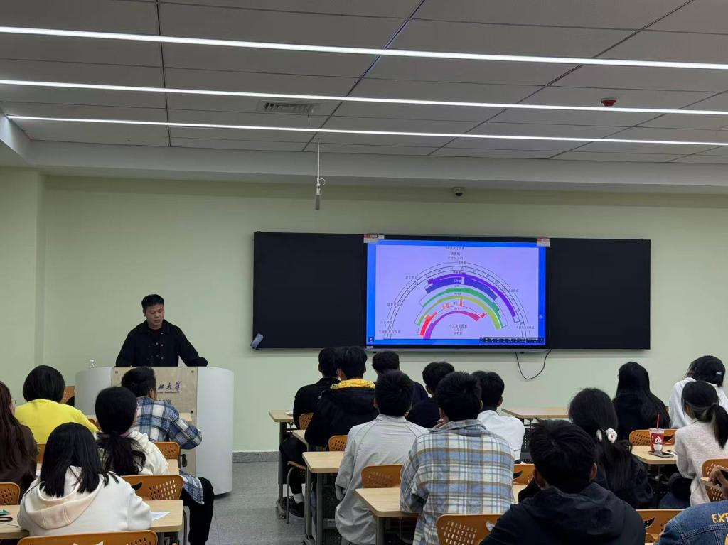在生涯规划的讲解环节,李老师详细阐述了“生涯规划的目的和意义”。他表示,合理的生涯规划能够帮助学生明确奋斗目标,激发学习动力,提高就业竞争力,同时也能让学生在面对人生选择时更加从容自信。为了让学生更直观地理解生涯规划,李老师引入了“人生百问”“人生A4纸”和“生涯彩虹图”等经典生涯理论。通过“人生百问”,引导学生深入思考自身的兴趣、优势和职业追求;借助“人生A4纸”,让学生清晰感知时间的宝贵,珍惜大学时光;运用“生涯彩虹图”,帮助学生认识到人生不同阶段的角色与责任,树立长远的生涯发展观念。这些生动形象的理论讲解,有效唤醒了学生的生涯意识。