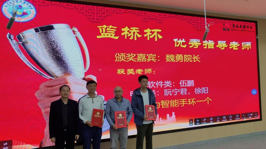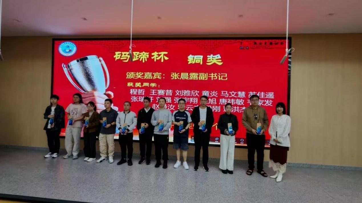 表彰环节有序进行。周箩鱼副院长首先宣读获奖名单,30位码蹄杯国奖选手与3位蓝桥杯国一选手依次上台,魏勇院长、周箩鱼副院长、张晨露副书记分别为他们颁发荣誉证书,肯定其在备赛过程中的努力与坚持。紧接着,张晨露副书记为优秀指导老师伍鹏、阮宁君、徐阳颁奖,感谢他们在选手培养、竞赛指导中的辛勤付出,台下掌声持续不断,为获奖师生送上真挚祝贺。