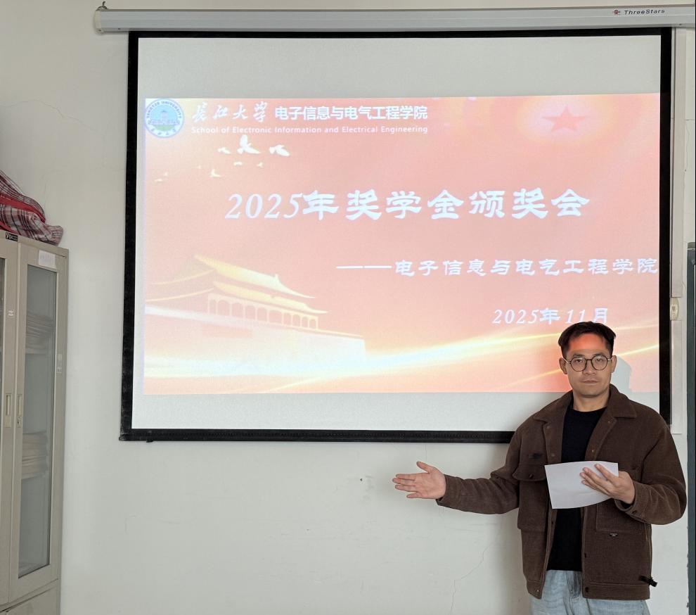 2025年度奖学金颁奖会如期在党员活动室举行。学院教师代表、获奖学生及学生代表齐聚现场,共同见证荣誉时刻。会议由学院资助专干朱锐老师主持。