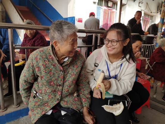 尽管天气寒冷,志愿者们仍然全部准时到达集合地点,在经过半个小时的路程后,同学们到达了荆州市金秋老年公寓,院长等人对于同学们的到来也表示了欢迎,爷爷奶奶看到了同学们,脸上也洋溢出幸福的笑容。根据同学们事先分配好的任务,每个人一来到老年公寓就主动开始了工作,有人扫地,有人切水果,有人搬凳子,还有人坐在老人旁边聊天、、、打扫完毕后,同学们愉快地和老人们做着游戏,不仅同学们和班主任老师阮宁君都献上了自己擅长的歌曲节目,就连老人们主动为同学们展现美妙的歌喉,现场十分热闹。看着老人们脸上温暖的笑容,同学们也感到无比的开心。