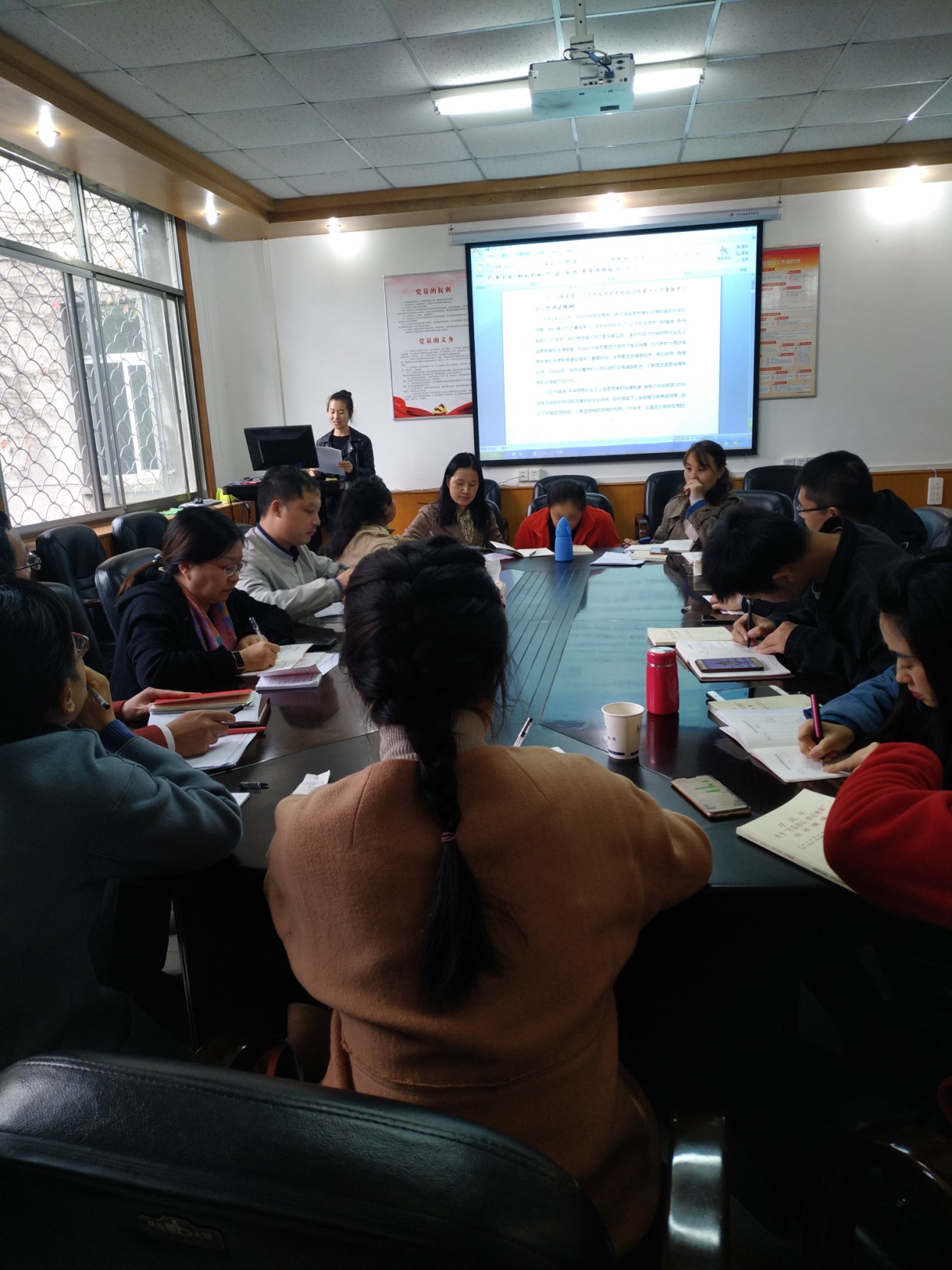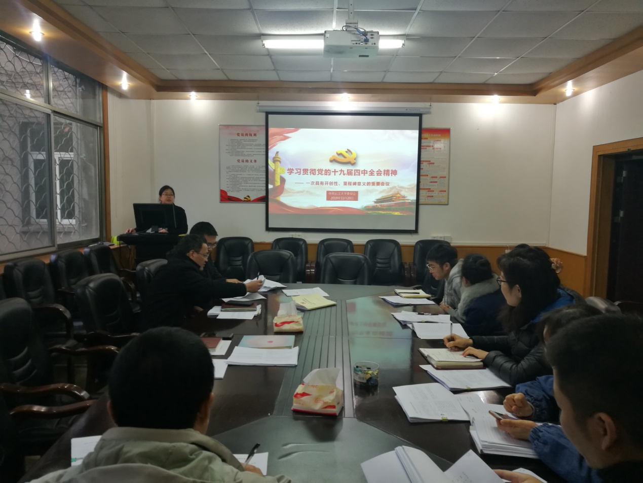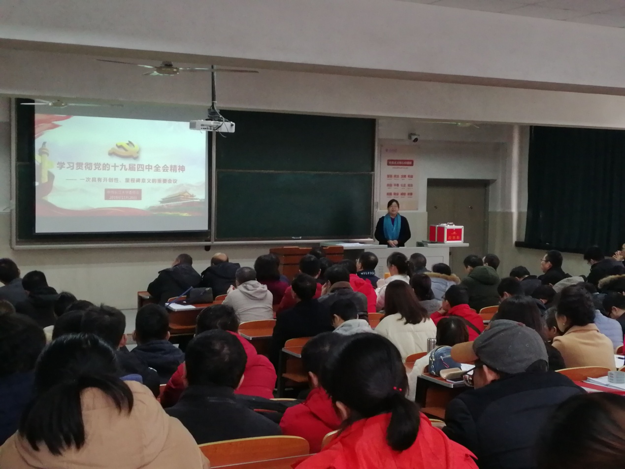 20191125日下午电信学院分党委分别召开理论学习中心组学习和党支部书记会议,由分党委书记宣讲四中全会精神。会后各党支部组织开展11月份第二次支部主题党日活动,集中学习贯彻党的十九届四中全会精神。28日分党委书记刘逸组织全体教职工和学生党员、发展对象学习贯彻党的十九届四中全会精神。在学习贯彻党的十九届四中全会精神会上,通过“一图读懂四中全会”熟悉了党的十九届四中全会的会议内容、我国国家制度和国家治理体系具有的显著优势、坚持和完善中国特色社会主义制度推进国家治理体系和治理能力现代化的总体目标和工作要求;通过观看微视频“字里行间看《决定》”,对《决定》中的3大板块、15个部分、200多项重大举措、222个高频关键词“制度”有了更全面的了解;通过学习“上善若水,水滴石穿——学习贯彻党的十九届四中全会精神等内容”,对党的十九届四中全会精神有了更深入的理解和体会。刘书记结合宣讲党的十九届四中全会精神,讲了一次形势与政策课,上了一堂生动的主题教育党课。