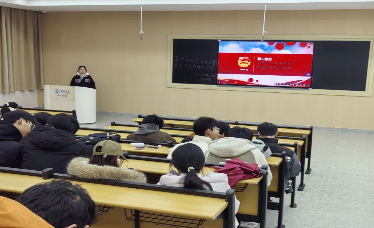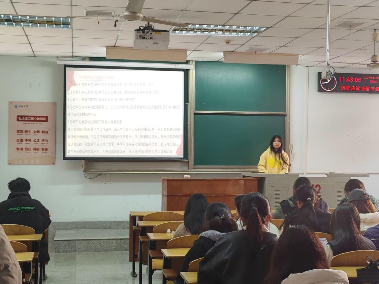 人工智能12403谢宇菲聚焦“深学笃行全会精神,挺膺担当时代使命”展开讲解。她先以思维导图的形式梳理了全会的核心部署与青年发展的关联点,随后结合班级学习、校园实践、志愿服务等日常场景,抛出“作为学生,如何将全会精神融入专业课学习?”“在校园活动中怎样体现青年担当?”等问题。同学们纷纷举手回应,有人提出要在专业竞赛中攻坚克难,有人表示要积极参与社区志愿服务,现场互动问答的形式让全会精神的学习从“听”转化为“思”。