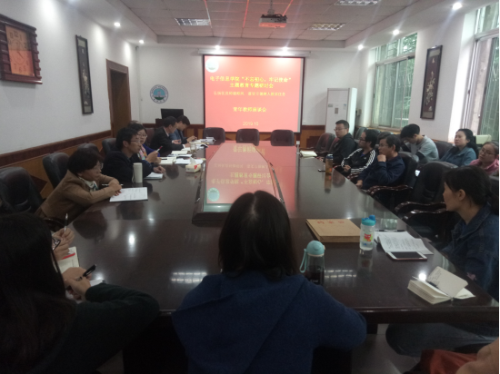 为了弘扬优良师德师风,落实立德树人根本任务,讨论如何更有效地推进“三全育人”和“五个思政”,2019年10月15日,在10教205会议室,电信学院举办院领导班子主题教育读书班第五次集体学习(扩大)会,全体院领导、正副系(中心)主任、党支部正副书记、35岁以下青年教师参加,会议由分党委书记,主题教育工作领导小组组长刘逸同志主持。