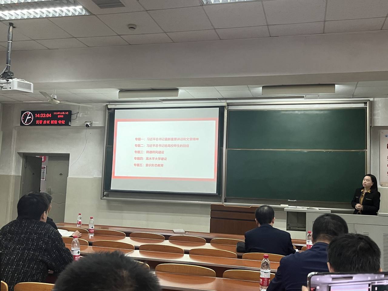 在10月的政治理论学习中,党委书记郭梅组织全体教职工一起学习了习近平总书记致信出席全国优秀教师代表座谈会各位老师的内容,致信鲜明指出教育家精神的深刻内涵,为新时代教师队伍建设指明了前进方向,提出了新的要求,提供了根本遵循,全院教师深受鼓舞。学院各党支部在当月的主题党日活动中也集体学习了习近平总书记的致信内容。