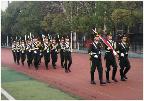 国旗护卫队旗手们手握着国旗、穿着统一的军装,迈着整齐的步伐朝升旗台走来。随着升旗手振臂一挥,鲜艳的五星红旗伴随着高昂的中华人民共和国国歌冉冉升起,全院师生行注目礼。