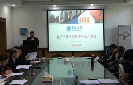 2019年4月16日16:30,我院新学期班主任会议在10教205召开,院长熊晓东、党委书记王红艳、副院长罗明璋、副院长李涛、党委副书记郭启炜及全体班主任参加了此次会议,会议由党委副书记郭启炜主持。