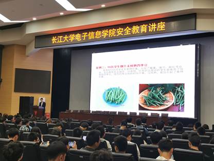 讲座第二项是电信学院辅导员万谦的讲话,万老师重点讲解了宿舍问题以及食品安全问题。他指出在周六周日学生不出宿舍产生大量的垃圾对宿舍环境的影响从而影响我们的健康,宿舍使用大功率的电器可能带来的危害,并以实例辽宁某高校大排档撂倒20名学生、94名学生倒于未炖熟的四季豆及上海商学院宿舍发生火灾几个实例来说明宿舍及食品安全问题的严重性。