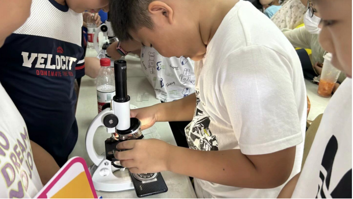 图为“愿益”团队成员开展趣味科技实验-显微镜观察切片