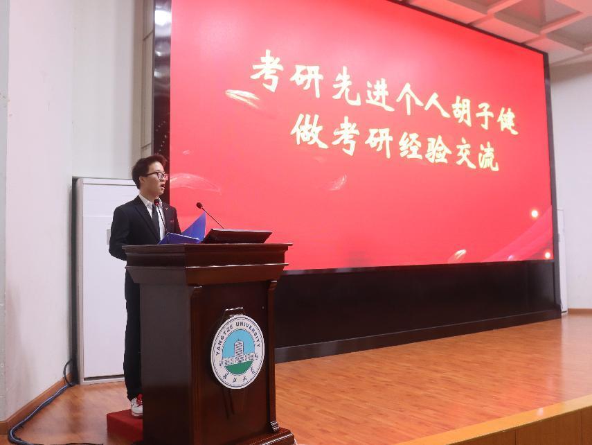 “选择要大于努力,向着正确的选择努力,厚积薄发,最终一定能抵达终点!”“坚定信念,所有认真的汗水终会结成秋天的硕果!”颁奖完毕后,2022届考研先进个人胡子健、陈天择先后上台分享考研与学习经验。