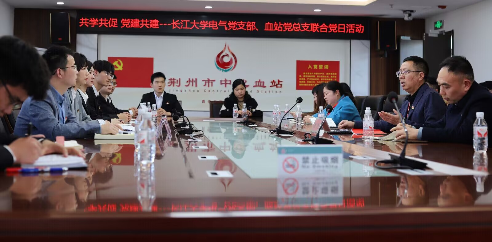 活动伊始双方分别介绍工作情况。电信学院党委副书记张晨露从支部概况、工作做法、党建品牌、荣誉成果四个方面对电气支部进行了全方位的阐述。荆州市中心血站党总支副书记、副站长黄华介绍了血站的党建工作并详细的介绍了血站党建品牌“我是红细胞”创建工作及当前我市无偿献血面对的困难、机遇和挑战。